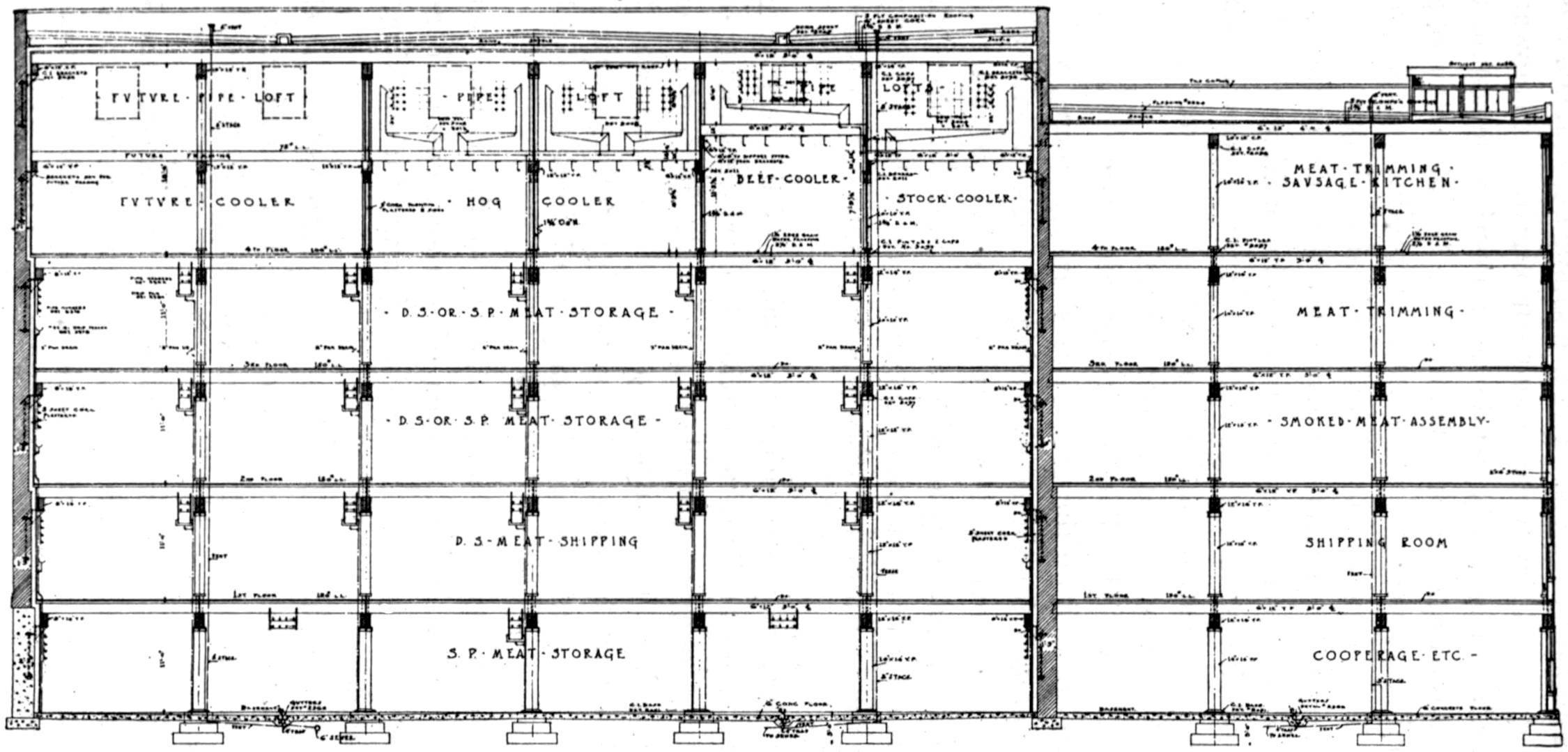 —A manufacturing building given over to the production of sausage, smoked meats, lard and the packing and shipping of same is immediately north of the cooler and pork buildings, and connected thereto at all floors where necessary. The city shipping department has its allotted space on the ground floor of the cooler building and the products finished in the manufacturing building move south toward the team loading platforms.