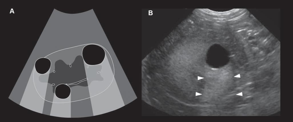 Figure1.15. Enhancement.A: Thisartifactisrepresentedbyazoneofincreasedechogenicity,behindafluid-filledstructure.Onthisschematicdrawing,severalrenalcystsareseenassociatedwithdistalenhancement B: Anexampleofasimilar cystispresentinthisdog,whereitisseenasarounded,well-definedanechoicrenalcystassociatedwithfarenhancement (arrowheads).