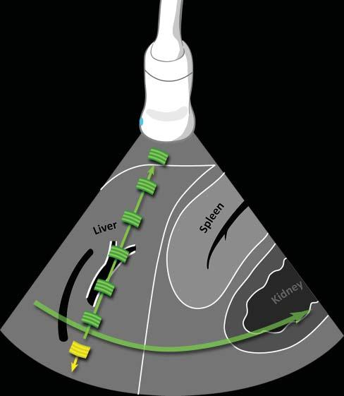 Figure1.1. Ultrasoundpropagationandimageformation. Eachultrasoundimageisformedbytheadditionofhundredsofindividualscanlines.Eachlineisproducedaftera singleultrasoundpulse(inyellow)isemittedbythetransducer.Asthispulsepropagatesthroughsofttissues,many echoes(ingreen)aregeneratedatinterfacesofdifferentacousticimpedance(suchashepatocytes–connectivetissue),producinganimageofvariableechogenicityandechotexture. Eachechoisanatomicallylocalizedbasedonthetimeinterval betweentheemittedpulseanditsreception.Afteraspecific time,anewpulseisemittedalonganadjacentline,producing anadditionalscanline.Scanlinesaregeneratedveryrapidly andsuccessively,producing15–60images/s,allowing“real time”ultrasonography.