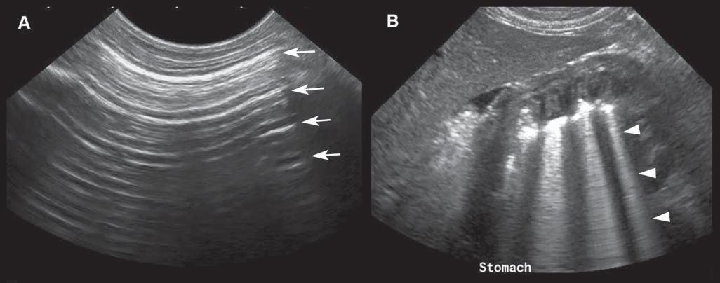 Figure1.16. Reverberationartifacts.A: Reverberationappearsasseriesofparallelandequallyspacedlines(arrows),when thebeamencountersahighlyreflectiveinterfacesuchasgas.Thecolonicwallinthenearfieldisbarelyvisualized. B: Comet tailalsoappearsasaseriesofshortandverycloselyspacedsuccessiveechoes(arrowheads)andisoftenseeninthestomach.