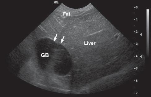 Figure1.20. Speederror. Whensoundtravelsthroughfat (withavelocityofabout1,450m/s),thereturningechoestake longertocomebacktothetransducerandarethusdisplayed deeperintheimagethantheyreallyare.Inthisnormaldog, theslowervelocityofultrasoundwavesthroughfatincomparisontoliver(around1,600m/s)resultsininaccuratedisplacementoftheGBfurtherawayfromthetransducer.