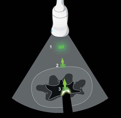 Figure1.3. Interactionsbetweenultrasoundwavesand tissues. Theemittedultrasoundpulseischargedwithenergy. Inthisexample,thepulseinitiallyinteractswiththeabdominalfat(1),causingacousticdiffusion(greenhalo)andpartly losingitsenergyasitcontinuesitscourse.Wheninteractingwithasmooth,linearinterfacesuchastherenalcapsule (2),astrongspecularreflectionoccursthatgeneratesahighly intenseecho(greenarrow).Theweakerultrasoundpulsethen reachestherenalpelviccalculus,whichabsorbsmostofthe waveenergywhilecausingastrongreflection(greenarrow). Anacousticshadowisgeneratedandtheinitialpulseenergy iscompletelydissipated.