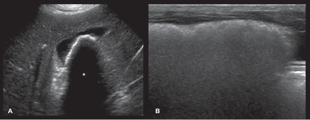 Figure1.13. Acousticshadowingisapoorlyechoictoanechoiczonelocatedbelowahighlyattenuatinginterface.A: The cleanshadowbehindthislargegallbladdercholelithhasthetriangularshapeofthemicroconvexprobethatwasused. B: Dirty shadowingisnotedassociatedwiththemixedgasandstoolspresentinthecolon.Theextensiveartifactisshapedsimilarlyto thelongitudinalprobethatwasused.