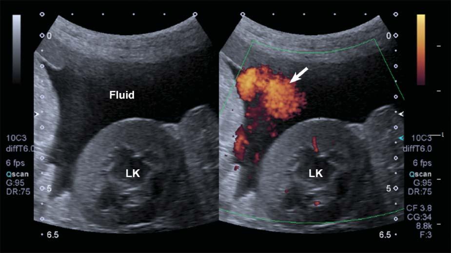 Figure1.25. Flash. SpuriousechoesoftenappearwhenusingpowerDopplerinmovingpatientsorwhenascitesispresent, limitingtheassessmentthetissueperfusioninthesecases.LK,leftkidney.