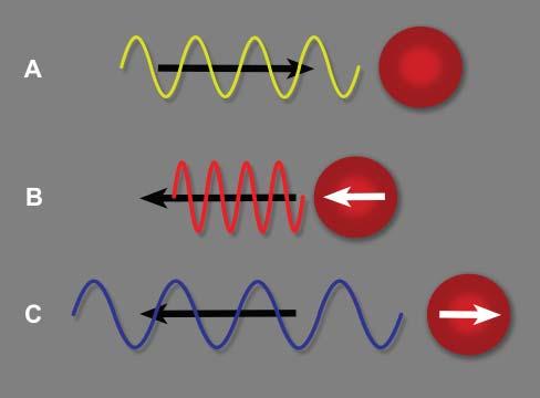 Figure1.10. Dopplereffect.A: Theultrasoundpulseemittedbytheprobemovesindirectionofaredbloodcell(RBC) ataspecificfrequency. B: IftheRBCmovestowardthispulse, apositiveDopplershiftoccurs,increasingthefrequencyof thereturningecho.Thewavelengthisreduced. C: IftheRBC movesawayfromthispulse,thefrequencyofthereturning echoisreducedanditswavelengthisincreased.Thisnegative Dopplershiftisdisplayedasabluesignalinthestandardcolor Dopplermode,whereasbloodflowmovinginthedirectionof theprobeisdisplayedinaredhue.