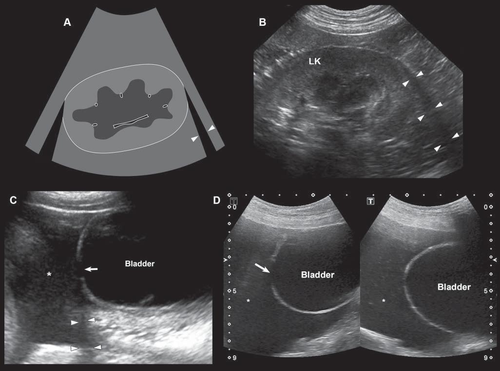 Figure1.14. Edgeshadowingandrefraction.A,B: Edgeshadowing(arrowheads)isoftenseeninprolongationoftherenal pole.LK,leftkidney. C: Thecurvatureofthebladderwallcausesbeamrefraction,whichresultsinanacousticshadow(arrowheads)inthisdogwithechogenicperitonealeffusion(*).Aholeinthebladderwall(arrow)isartifactuallycreated. D: Inanother dogwithcardiactamponadeandmarkedperitonealeffusion(*),theartifactualholeinthebladderwall(arrow)isattenuated byrepositioningthetransducerwithadifferentangulation.