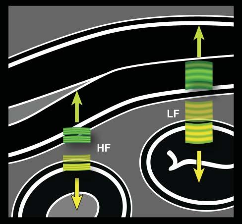 Figure1.5. Ultrasoundfrequencyversusaxialresolution. Thehigherthefrequency,theshorterthepulse.Becausethe lengthofthepulsedoesnotchangeindepthorafterinteractionwithtissues,high-frequency(HF)echoes(ingreen)that comebacktothetransducerarebetterdiscriminatedbythe system.Closelyassociatedinterfaces,suchassmallintestinal walllayers,arethenbetterrepresented.Conversely,echoes fromcloselyalignedlayersgeneratedbyalow-frequency(LF) pulse(inyellow)partlyoverlapandareinterpretedbythesystemasoriginatingfromasingleinterface.Thisphenomenon isexaggeratedinthisillustrationforbettercomprehensionof thisimportantconcept.