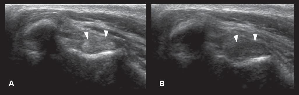 Figure1.21. Anisotropy.A: Normalcross-sectionalappearanceofthebicepstendon(arrowheads),withtheprobebeing perpendiculartothestructure. B: Thedecreaseinechogenicityofthetendonisduetoanobliquepositionoftheprobe.This canbeeasilycorrectedbychangingtheprobeangle.Thisartifactcouldbemisinterpretedasacorelesion.