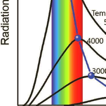 meaning ‘to glow white.’ It specifically refers to the visible region, unlike thermal radiation which refers to IR or other electromagnetic radiation. For example, the white light of the tungsten filament bulb is equal to blackbody radiation at around 2900 K. Irradiating blackbodies in the chromaticity diagram form the Planckian locus. From low to very high temperatures, the emission of irradiating blackbodies changes from deep red to orange, yellowish-white, white, and bluish-white at the end [7–9].