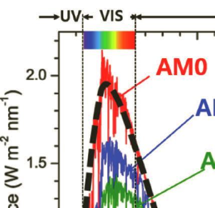 The optical path length through the atmosphere is determined by the air mass (AM) coefficient, which is defined as a ratio relative to the path length vertically upwards. The solar spectrum outside the atmosphere, approximated by the 5,800 K black body, is named
