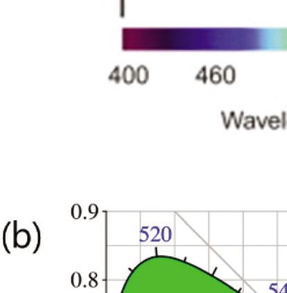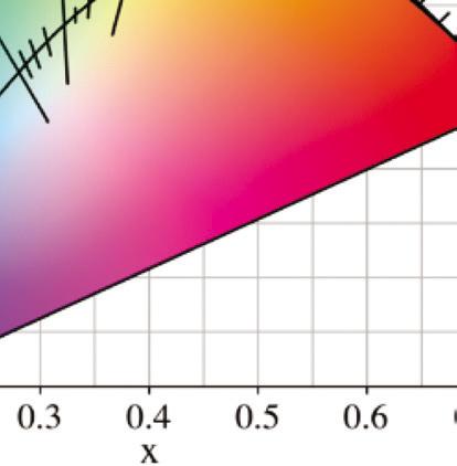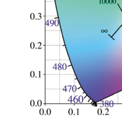 A chromaticity diagram is a full plot of all visible colors sensible by average human eyes (Fig. 1.3b). The xy values indicate the contribution of the three primaries (RGB), and the boundaries indicate the highest saturation of spectral colors. In the chromaticity diagram, hot objects emit electromagnetic radiation at different