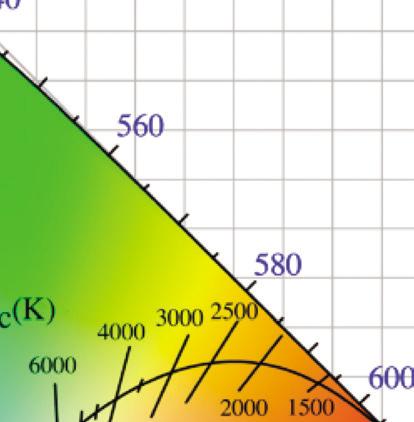 where T is the absolute temperature and a is Wien’s displacement constant, equal to 2.9 × 10–3 m⋅K. Wien’s law states that the peak wavelength is inversely proportional to temperature but the peak frequency is directly proportional to temperature [11, 12]. When the temperature of an object rises, total radiation increases, and the emission peak shifts into the visible radiation range, causing the object starts to emit dark red and orange-red colors, and at very high temperatures the emission becomes white, as shown in the chromaticity diagram, Fig. 1.3.