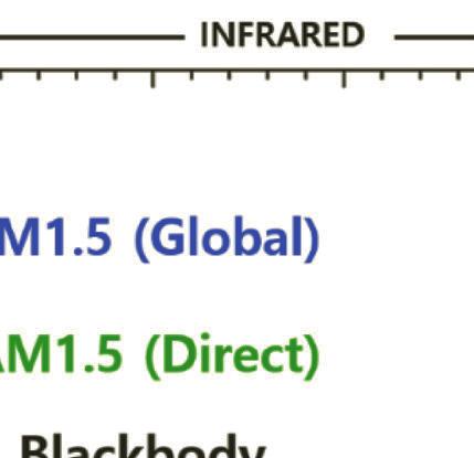 The reference spectrum of AM0 signifies the spectral of solar irradiance above the atmosphere. In 2000, the American Society for Testing and Materials established the reference spectrum of E490-00a (2019) as a standard solar constant for AM0 (zero air mass spectral irradiance). Furthermore, two reference spectra are included for the irradiance under absolute air mass of AM1.5G or Global spectrum (ASTM G173). AM1.5G is the spectrum that includes the blue sky and the surrounding ground. The integrated power of AM1.5G is 1000 W·m–2 with a photon flux of 4.31E21 S–1m–2. The standard AM1.5D or Direct spectrum—unlike AM1.5G—includes radiation coming only from small surroundings of the sun and projected orthogonally onto the cell. The difference between the AM1.5D and AM1.5G spectra is mainly the blue sky and light scattering in the atmosphere. The integrated power density of AM1.5 D is 900 W·m–2 [27–30].