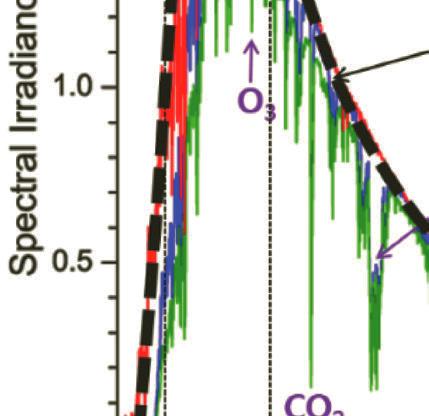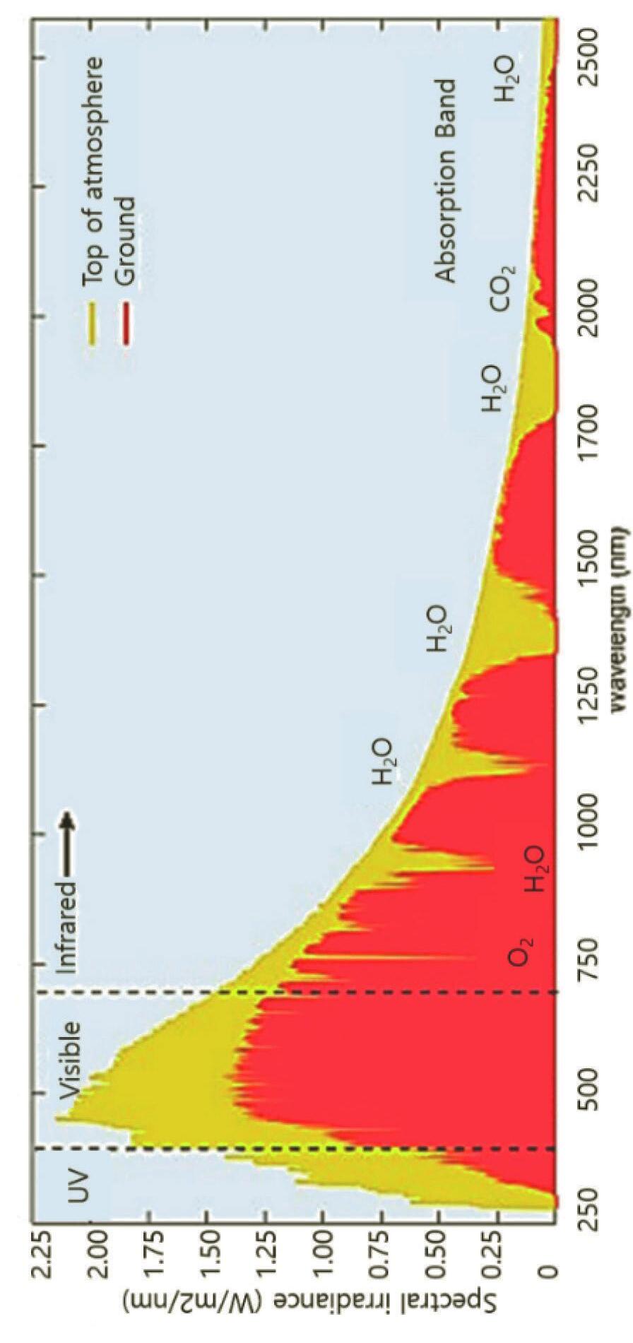 Through the atmosphere, light is influenced by gases, aerosols, and dust as they absorb photons with specific absorption bands. As sunlight reaches the atmosphere, most UVs (below 300 nm) get absorbed by ozone (O3) and most IRs (above 2 mm) are absorbed by atmospheric gases such as water vapor (H2O) and carbon dioxide (CO2) [2, 3]. Figure 1.2 shows the solar spectrum with several photons arriving at the atmosphere and Earth surfaces as a function of wavelength.
