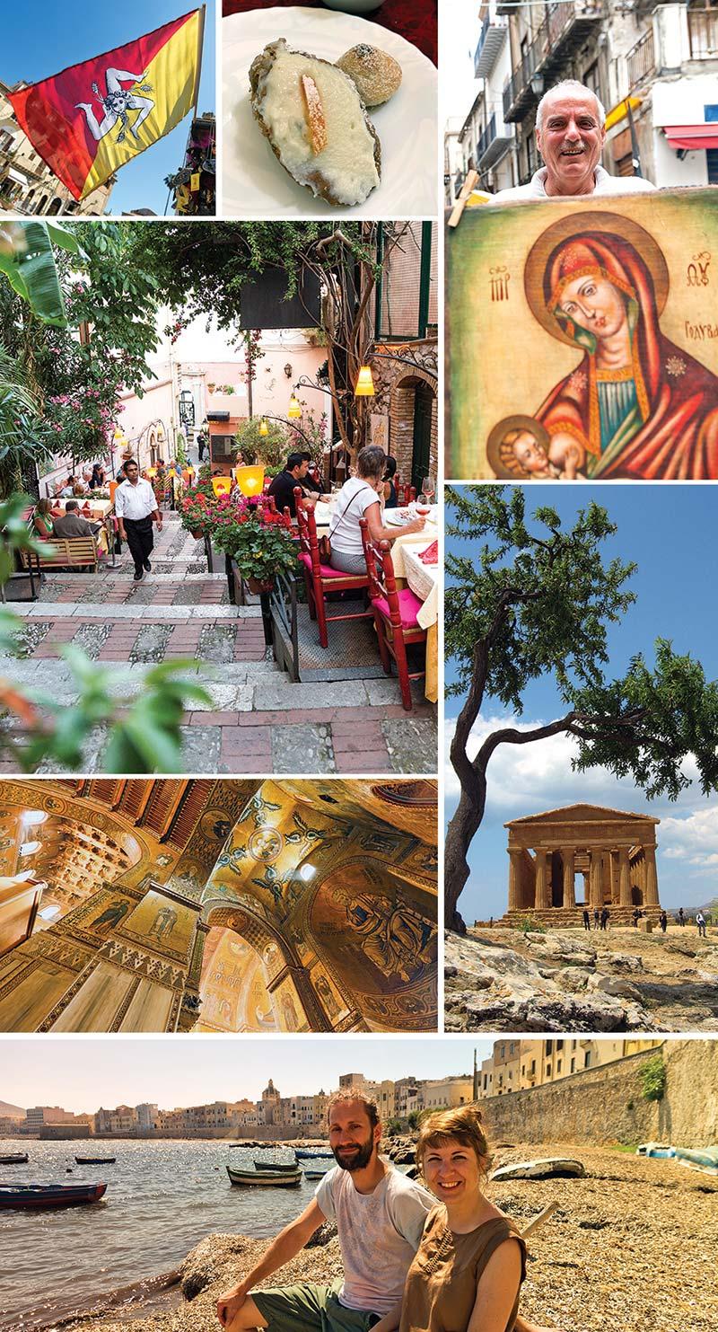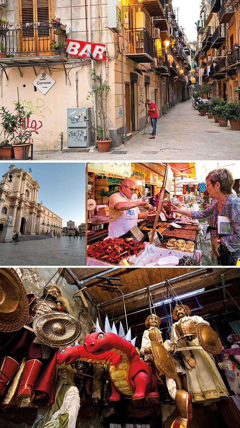 Byzantine mosaics of Monreale (opposite); Palermo back street; Ballarò street market; Siracusa’s Puppet Museum; Siracusa’s Baroque main square