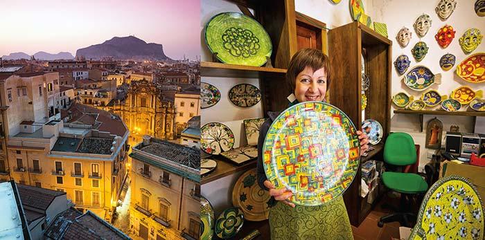 Twilight Palermo, cradled by nearby mountains; eye-catching ceramics in