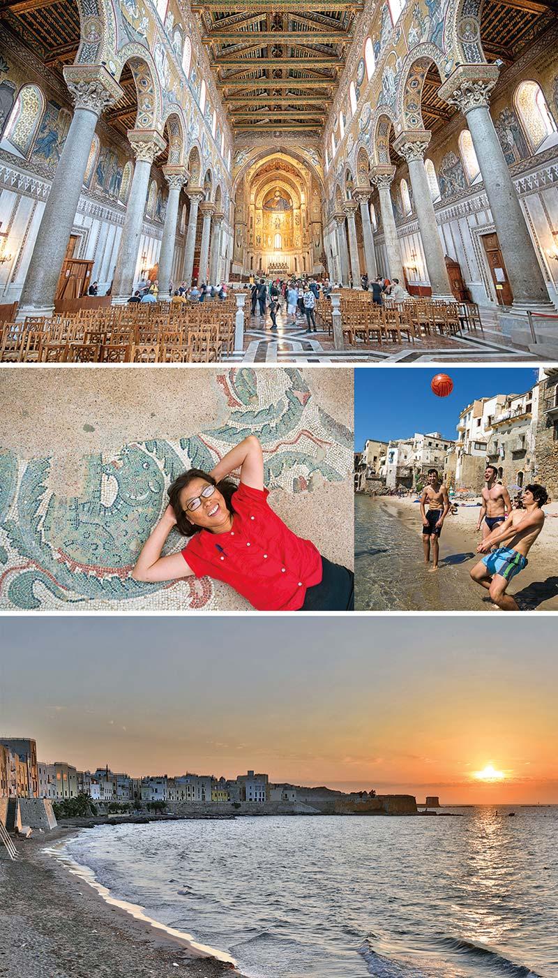 Monreale Cathedral; beach fun in Cefalù; sunset in Trapani; mosaic floor at Villa Romana del Casale; Monreale’s cloister (opposite)