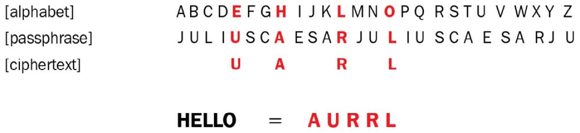 [JULIUSCAESAR] and repeat it, putting each letter of the alphabet in correspondence with a character from the passphrase in the second row, as shown in the following screenshot.