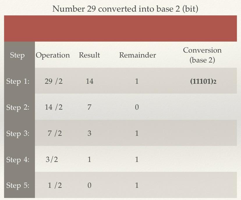 Figure 1.2 – Conversion of the number 29 into base 2 (bits)