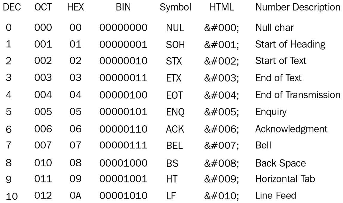Figure 1.3 – The first 10 characters and symbols expressed in ASCII code