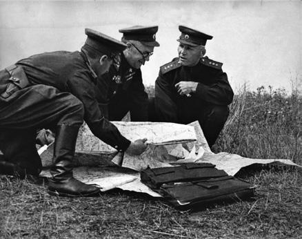 Marshal Zhukov, center, consults with Konev on the right during the fighting around Kursk in 1943. As the Soviet forces drove into central Europe the numerous front organizations were consolidated into fewer, more powerful units. Marshals Zhukov and Konev, the USSR’s leading military commanders and fierce rivals, led the 1st Belarussian and 1st Ukrainian Fronts during the drive from Warsaw to Berlin in the last months of the war. (mil.ru/Wikimedia Commons)