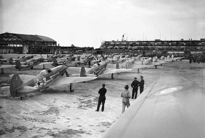 The famous NormandieNiemen Squadron was formed by Free French pilots who flew from Syria to the Soviet Union earlier in the war and were offered by de Gaul to Stalin. Later formed into a regiment, the squadron operated Yak-3s and operated over East Prussia and Konigsberg in 1945 as part of the 1st Air Army. The photo shows the Yak-3s of the regiment on their return to France in June 1945. (AFP via Getty Images)