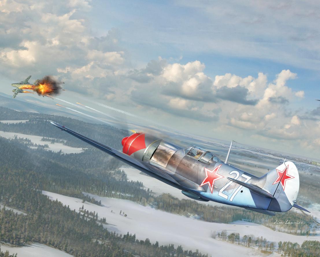 After its huge losses during the first months of the war, the Soviets battled the Luftwaffe by fielding large numbers of fighters and poorly trained pilots, but the flexible finger-fourschwarm tactics of the veteran Luftwaffe pilots, flying Bf 109 fighters superior to the VVS’s I-16s, I-153s, LaGG-3s, and MiG-3s, inflicted heavy losses. By 1943, the tide in the air started to turn as improved Soviet fighter designs joined the force and, by 1945, VVS fighter regiments were equipped with the latest Yak-3s, Yak-9s, La-5FNs, and La-7s. Over 36,000 Yak fighters of all models were produced during the war, 16,769 of them various models of the Yak-9. Most Yak-9s were armed with a 20mm cannon and two 12.7mm machine guns and were able to deliver a 200kg bomb load. A total of 3,921 of the later Yak-9P/U versions were produced through the summer of 1945. The Yak-3 was a pure interceptor with excellent dogfighting capabilities below 5,000 meters, where most aerial combat on the Eastern Front took place. The Yak-3 was one of the most maneuverable fighters of the war and had one of the highest kill-to-loss ratios of any Soviet fighter. When the famous French-manned Normandie-Niemen Squadron was offered its pick of fighter types, it chose the Yak-3, and after the war returned to France with the surviving 42 aircraft. The Lavochkin La-5FN gave Soviet pilots an aircraft able to match the Bf 109 G in 1943. Losses of all La-5 types fell from 1,460 in 1943 to 825 in 1944. With the La-7, the VVS had a fighter superior to anything it would face on the Eastern Front, and about 400 had joined the VVS at the front in early 1945. The VVS flew numbers of P-39 Aircobras received via lend-lease until the end of the war, being the recipient of almost half of the aircraft produced. The aircraft was withdrawn from service in the West due to its poor high-altitude performance, but was favored by the Soviets for its firepower and maneuverability in the low-level air engagements typical of the air war on the Eastern Front. As was the case with most Western aircraft, Soviet pilots liked the P-39’s roomy cockpit and excellent radios. The second-highest-ranking VVS ace, Aleksandr Pokryshkin, scored most of his 59 victories flying the aircraft that the Soviets dubbed the Kobra.