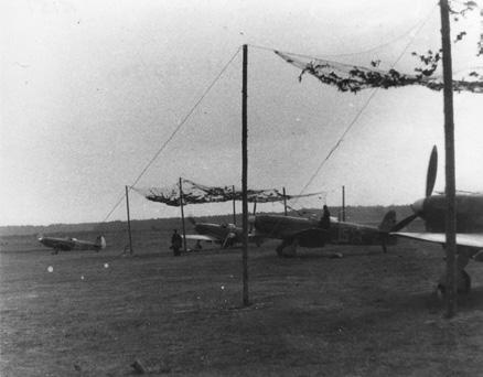 VVS fighters at a field airstrip with camouflage netting covering some of the parking area. The Soviet military placed a major emphasis on maskirovka – camouflage, concealment, and deception – activities. (Nik Cornish at www.Stavka.photos)