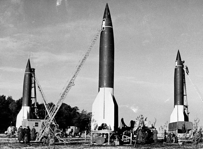 German Army A-4 ballistic missiles in launch position. Hitler and his leaders hoped that new technology weapons would turn the tide of war in their favor in 1944 and 1945. Many of the systems were never fielded, and those that were had less impact than anticipated. Almost all, with the exception of the Mistel Composite bomber, were used almost exclusively against the Western Allies. (Roger Viollet via Getty Images)