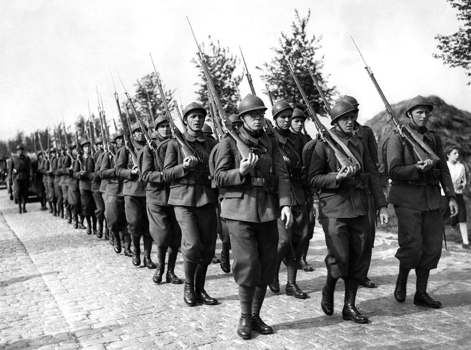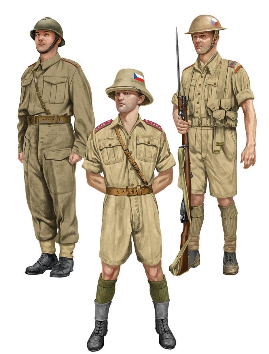 Members of the 1st Czechoslovak Inf Div equipped with French Army khaki uniforms, 1940. The khaki-painted M1926 Adrian helmets lack a frontal plate; the M1938 tunics, with 5 front buttons, have turndown collars with khaki tabs to conceal French branch-colour unit numerals and pipings, and internal waist pockets with buttonless diagonal flaps. No French or Czechoslovak insignia are visible. The baggy M1938 trousers are worn with khaki puttees and brown ankle boots, and the belt equipment is brown leather. They carry 7.5mm French MAS36 bolt-action rifles. (Associated Press via Alamy)