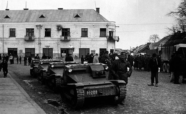 16 Mar 1939: a platoon of Italian-built Ansaldo L3/35 tankettes of the Royal Hungarian Army photographed in Chust, Carpathian Ruthenia. The crewmen are wearing M1937 brown leather protective helmets and M1935 brown leather tunics.