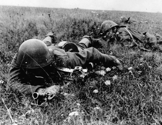 May 1938: Czechoslovak Army mounted machine-gunners (probably from one of the four Mobile Divs) haul their weapon through low cover in the disputed Sudetenland frontier territory, ready to engage German insurgents. They wear M1930 khaki field uniforms with M1932/34 steel helmets, and have gas masks slung on their backs; note too the spurs. At left, a senior private (svobodník) shows one silver rank stud on the branch-colour tab at the base of his shoulder straps. (Christopher Harrod Collection)