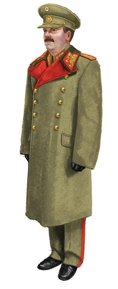 branch-colour collar patches, and metal unit numerals on the shoulder straps; 6 front buttons, two cuff-buttons; point-ended buttoned shoulder straps with branch-colour piping; two external breast pockets with box pleats and scalloped buttoned flaps, and large ‘bellows’ waist pockets with buttoned flaps. Generals wore two wide bright red trouser stripes flanking red seam piping. A brown leather ‘Sam Browne’ belt supported a 9mm M1924 pistol in an M1922 holster.