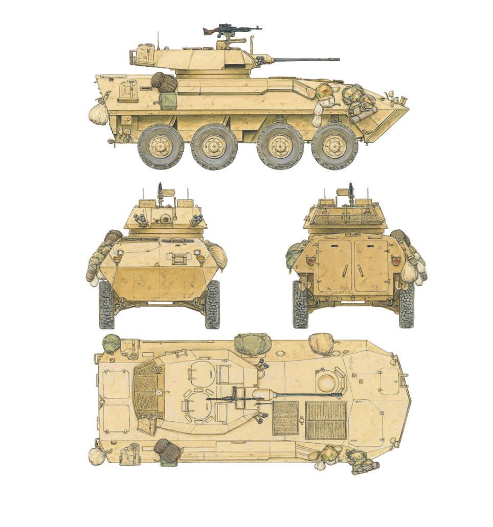 M240 machine guns and eight smoke grenade dischargers. Power comes from a Detroit Diesel 6V53T turbocharged diesel engine, developing 275hp. The LAV-25’s survivability is primarily dependent on its mobility, as its armor is light, and the vehicle is fully amphibious. Note that this vehicle also has a cowling fitted over the engine exhaust to reduce the thermal signature of the vehicle, a common practice in Iraq.