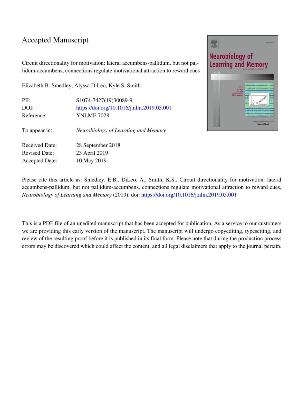 Circuit directionality for motivation: lateral accumbenspallidum, but not pallidum-accumbens, connections regulate motivational attraction to reward cues Elizabeth B. Smedley & Alyssa Dileo & Kyle S. Smith
