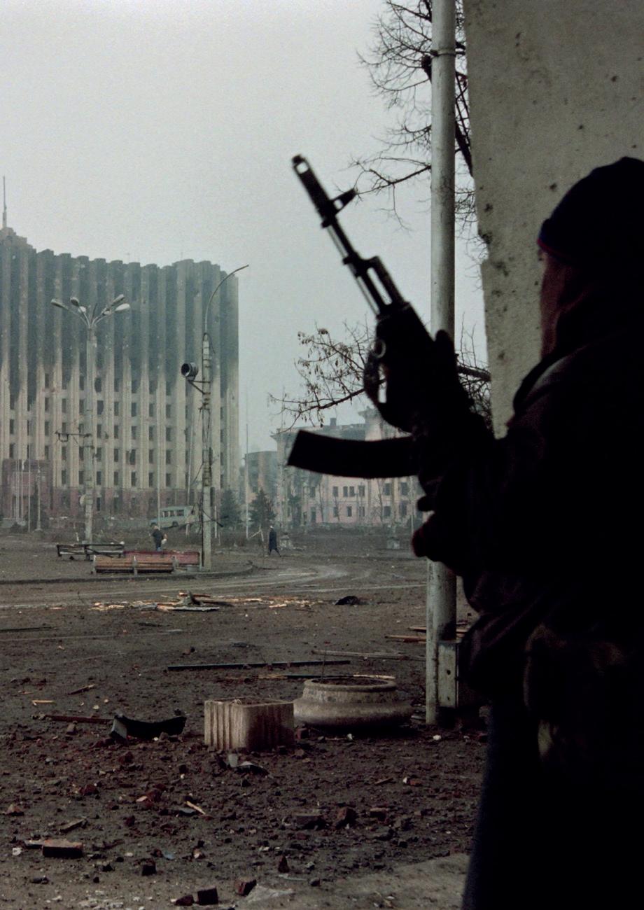 A Chechen volunteer armed with an AK - 74 takes cover behind a rebel tank during street fighting in Grozny on