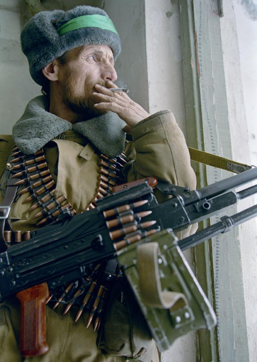 A Chechen rebel, an Islamic green band sewn onto his hat as a recognition symbol (given his Soviet-era army coat), with a slung PKM machine gun.