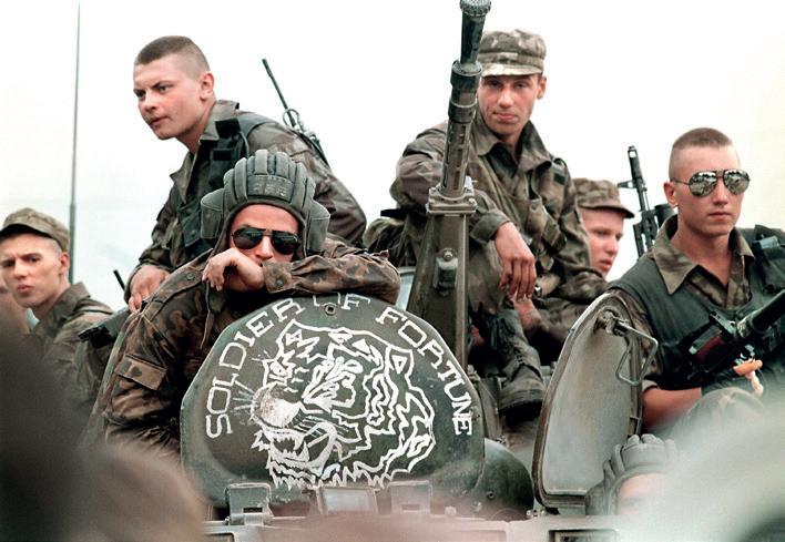 Russian soldiers ride a BTR - 60 personnel carrier as they move through Grozny in 1995. The ‘Soldier of Fortune’ markings are strictly unofficial, and reflect the shaky state of discipline at the time. (ALEXANDER NEMENOV/AFP via Getty Images)