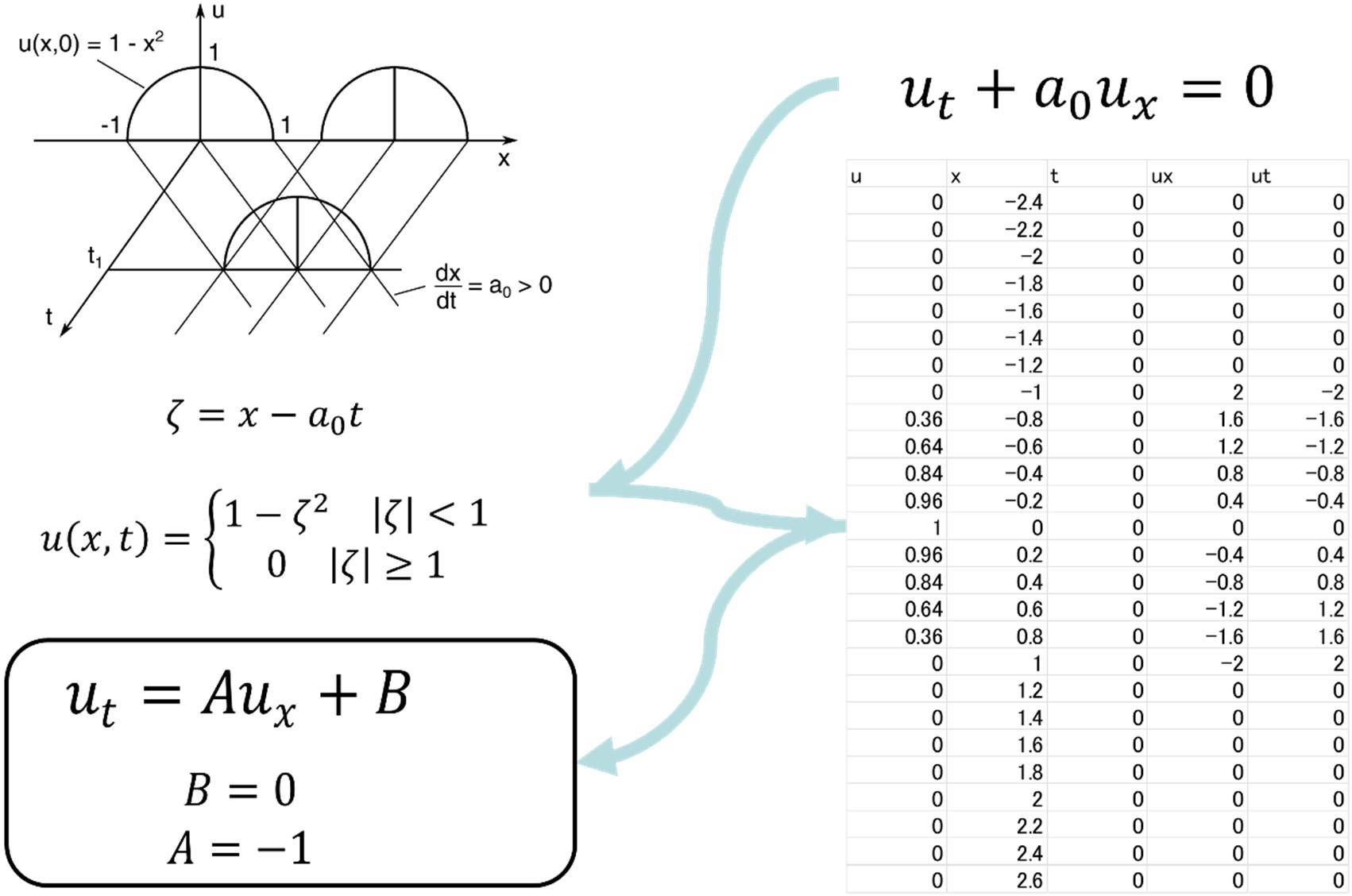 Theconcentration u canbecalculatedbysettingthetime t andtheposition x andusingthisexactsolution.Furthermore,thisexactsolutionitself canbedifferentiatedtocalculatetimederivativeof uut orspacederivation of uux .Regressionanalysisisthenusedtoobtainaregressionequationthat describestimederivativeasspatialderivative.Thisregressionequationis aderivedPDE(Figure1.13).