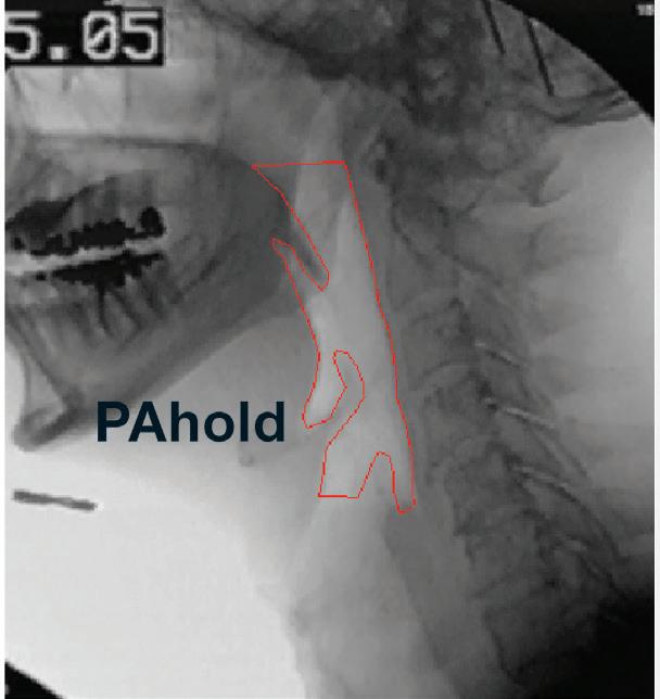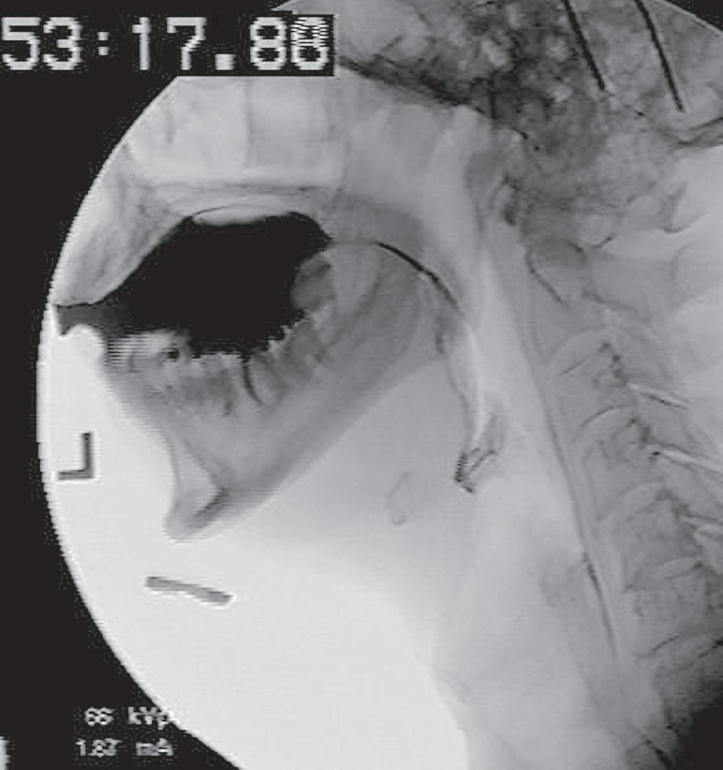 Figure 1–5. Lateral view from videofluoroscopic swallowing study: Preparatory phase. Note bolus in the oral cavity on the superior surface of the tongue. Palate closes against the tongue base to close posterior oral cavity from the oropharynx. Respiration is via nasal cavity as the velopharyngeal valve closes off the oral cavity and opens the posterior nasopharynx.