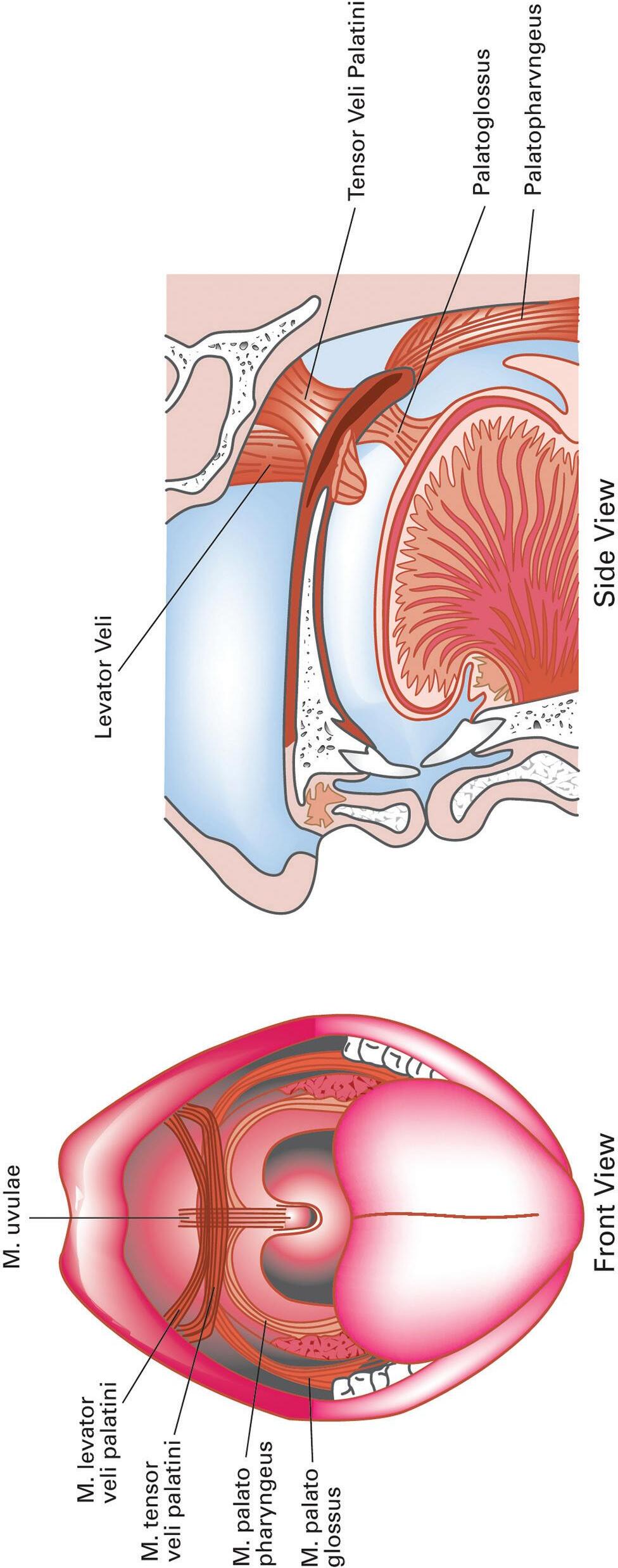 Figure 1–4. Muscles of the soft palate. Note the fibers of the palatoglossus muscle between the palate and the tongue base. Contraction of this muscle approximates the soft palate and the tongue base, effectively closing off the back of the oral cavity from the pharynx during oral bolus preparation and prevents early entrance of the bolus into the pharynx.