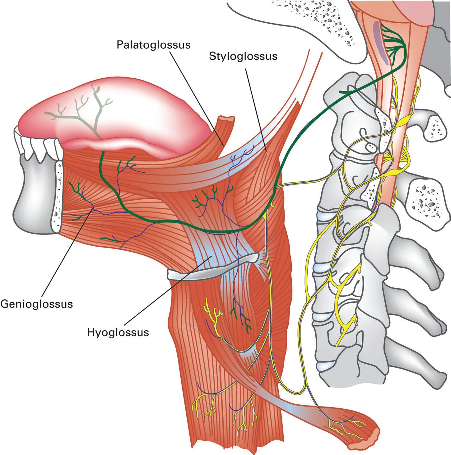 Cranial nerve XII, the hypoglossal nerve, carries the motor nerve fibers that innervate both the intrinsic and extrinsic tongue muscles, except for the palatoglossus muscles (see Figure 1–3).