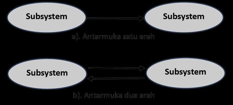 Pada Gambar 1.1 terdapat antarmuka subsistem yang saling terkaitdalamsuatusistem.Antarmukasubsistemmerupakanarea dimana pertukaran informasi, data atau sumber daya terjadi antara sub sistem dalam suatu sistem. Antarmuka subsistem merupakan hal yang penting karena tanpa antarmuka subsistem maka suatu sistem hanya berisi sekumpulan subsistem yang berdiri sendiri dan tidak saling berkaitan. Gambar 1.2 merupakan dua model hubungan antarmuka subsistem dalam suatu sistem.