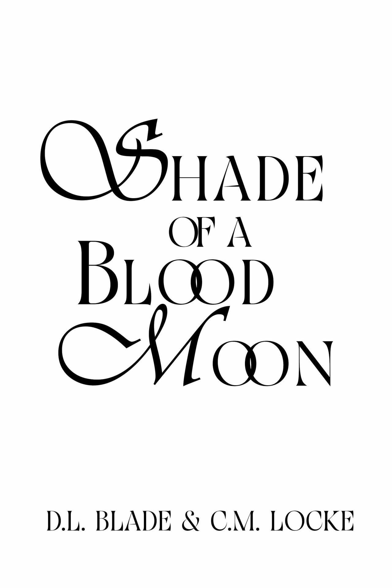 We,D.L.BladeandC.M.Locke,decidedtocombineourcreativemindsandco-writeabooktogether.Thisisthefirstofa three-bookseries It’s a paranormal darkromance thatmaycontaincontentthat's offensive to some readers For full content warningsfor Shade of a Blood Moon,visitD.L.Blade’swebsite,www.dlblade.com Shade of a Blood Moon is a character/world spin-off fromthe Blood of the Chosen trilogy: Stalked, Taken & Hunted, writtenbyD.L.Blade.Todownloadthisseries,visithere: Stalked. Youdo not havetoreadtheoriginalseriestounderstand Shade of a Blood Moon Wewroteitinawaywheretheworldcan standonitsown.However,theglossaryatthebeginningcanhelpclarifyanyreferencestoeventsfromtheoriginalseries. Though Shade of the Blood Moon IS a darkromance, Stalked is not. Itwill, however, containdarkelements suchas the villainbecomingobsessedwiththeheroine,violence,andstrongsexual content The Blood of the Chosen trilogyis aslowburnromance and will graduallybuild throughout all three books. It will have a different feel and tropes from Shade of a Blood Moon
