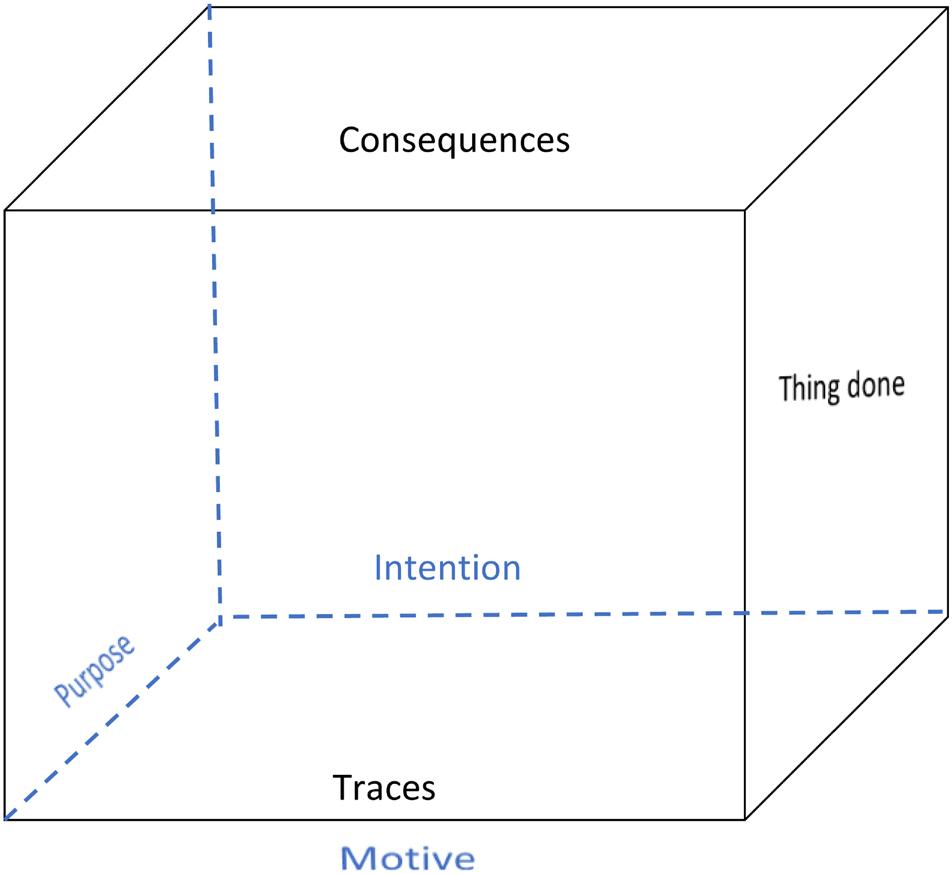 Hegel’s writings on action form the roots from which Ricoeur’s picture of actions as cubical volumes with inner/outer, surface/foundation and foreground/background perspectives grow (as illustrated in Figure 1, below). Ricoeur models actions on texts whose ‘different topics are not on the same altitude’ (Ricoeur [1986] 2008: 160). Accordingly, ‘the reconstruction of the whole has a perspectivist aspect similar to that of perception’ and ‘a specific kind of one-sidedness is implied in the act of reading . . . what we want to understand is not something hidden behind the text, but something disclosed in front of it’ (Ricoeur [1986] 2008: 160).10