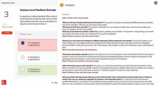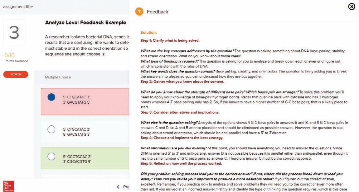 For many students, choosing the right answer is not necessarily based on applying content correctly; it is more a matter of increasing their statistical odds of guessing. A major fault with this approach is students don’t learn how to process the questions correctly, mostly because they are repeating and reinforcing their mistakes rather than reflecting and learning from them. To help students develop problem-solving skills, all higher level Blooms questions in Connect are supported with hints, to help students focus on important information for answering the questions, and detailed feedback that walks students through the problem-solving process, using Socratic questions in a decision-tree-style framework to scaffold