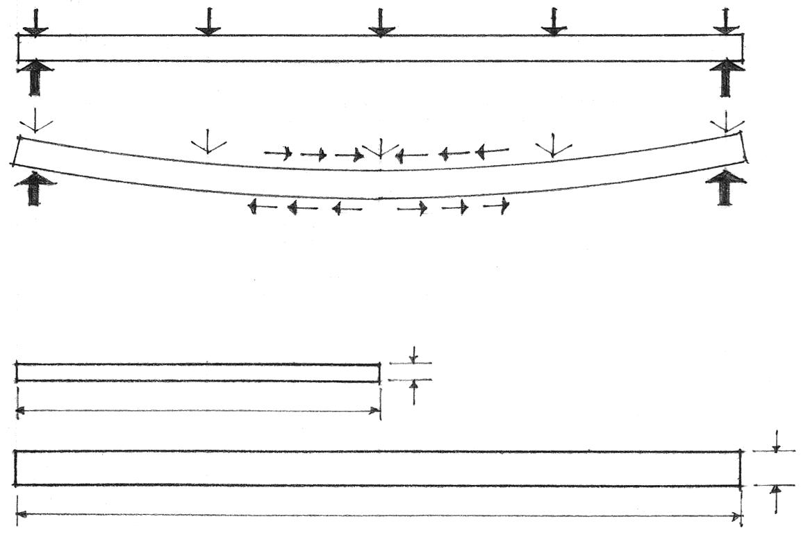 A beam is a horizontal member that transmits forces perpendicular to itself along its length to its supports. A beam is subject to bending and deflection, which result in an internal combination of compressive and tensile stresses. These stresses are proportionally greater along the upper and lower region of a beam’s cross section. Increasing depth and placing material where stresses are greatest optimize a beam’s performance.