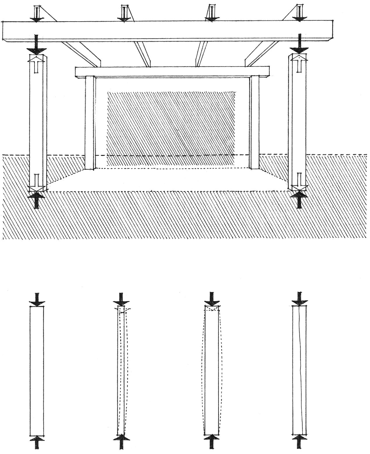 The two basic linear structural elements are the column and the beam. A column is a vertical support that transmits compressive forces downward along its shaft. The thicker a column is in relation to its height, the greater its load-bearing capacity and its ability to resist buckling resulting from off-center loading or lateral forces