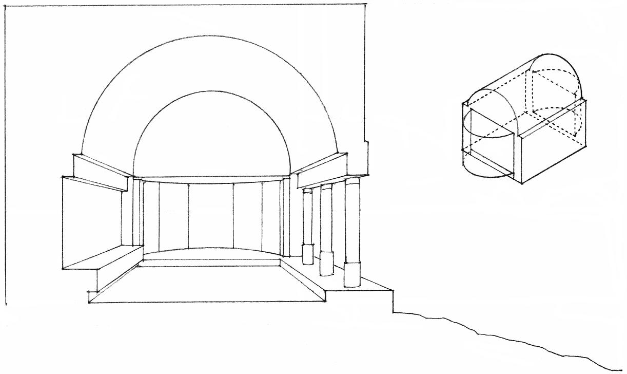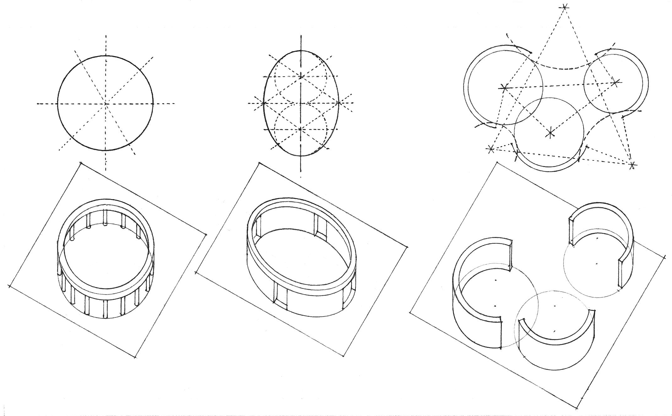 The simplest curvilinear space is a circular one. It is compact and self-centering. Although it creates a focus on its center, a circular space also relates to the surrounding space equally in all directions. It has no front, back, or sides, unless these are defined by other elements.