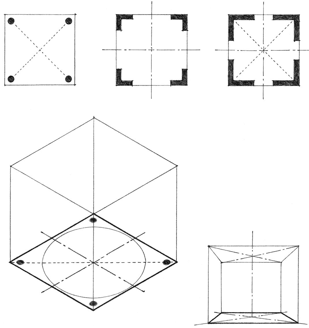 A square room, where the length of the space equals its width, is static in quality and often formal in character. The equality of the four sides focuses our attention in on the room’s center. This centrality can be enhanced or emphasized by covering the space with a pyramidal or dome structure.